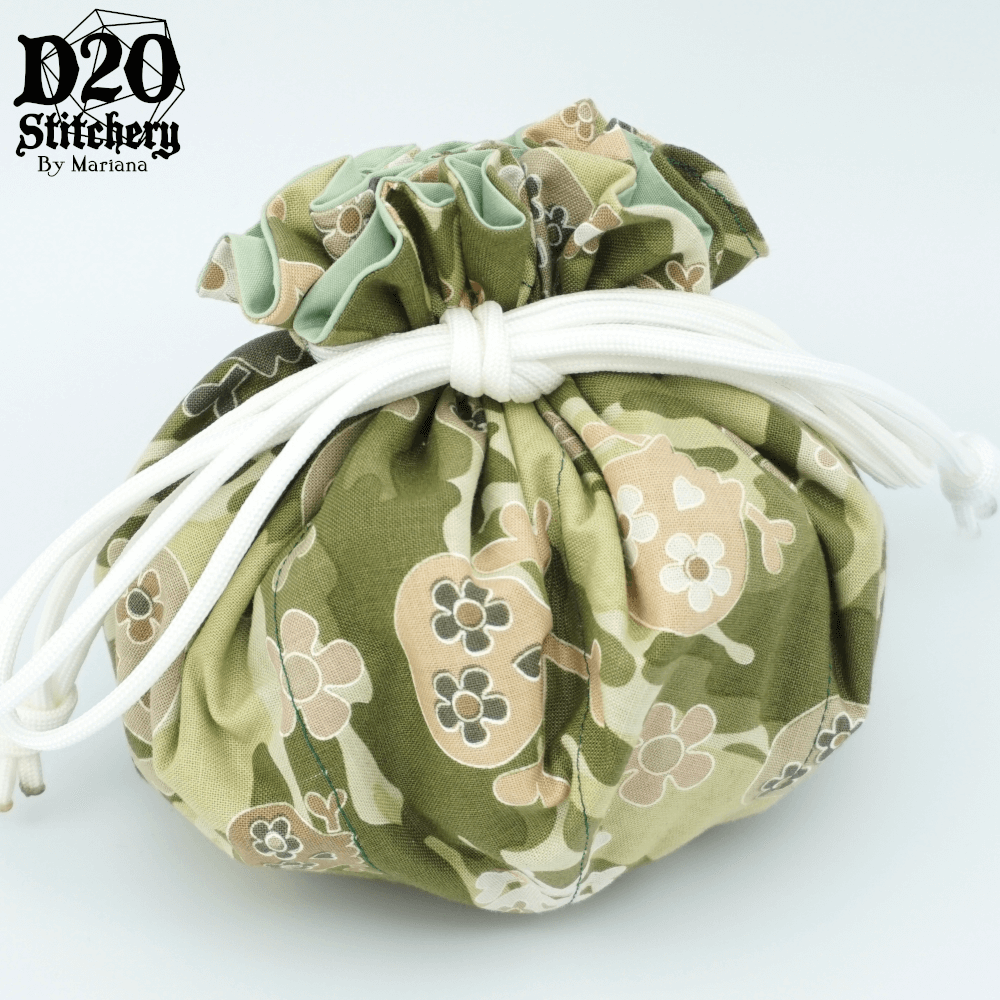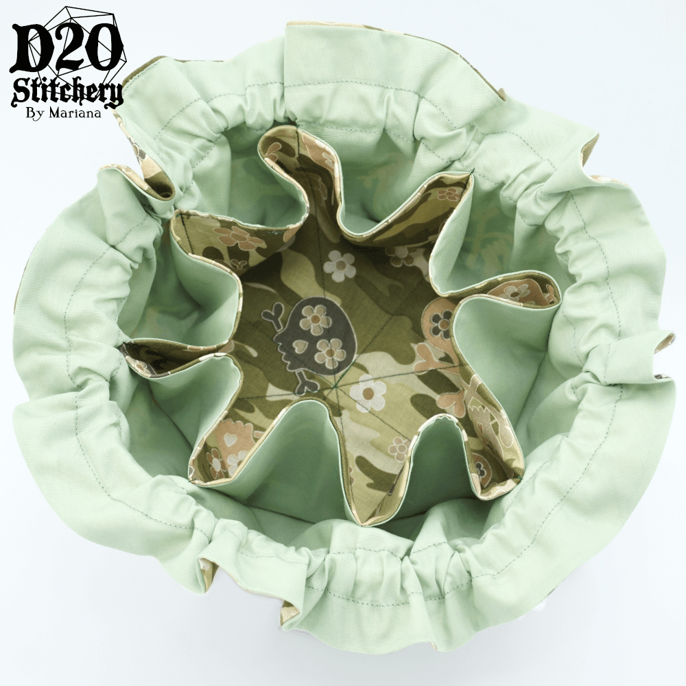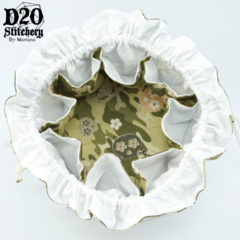 A hand-crafted, 8-pocket drawstring dice bag to take on all your epic quests! So big, there will even be room left over for a mini, tokens, or whatever your heart desires. This bag looks small on the outside, but has tons of room on the inside! The bag can be opened completely to transform into a dice tray, and the sides still stay up to keep excited dice from bouncing away!