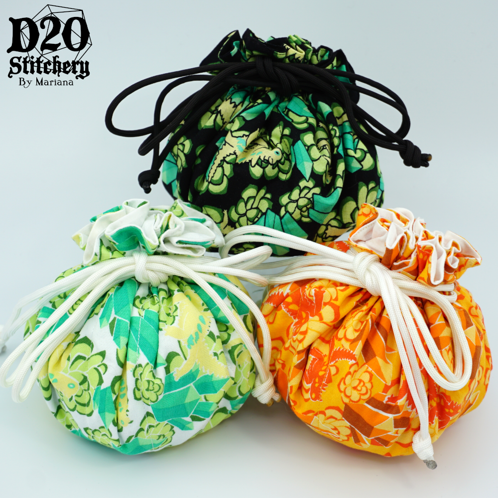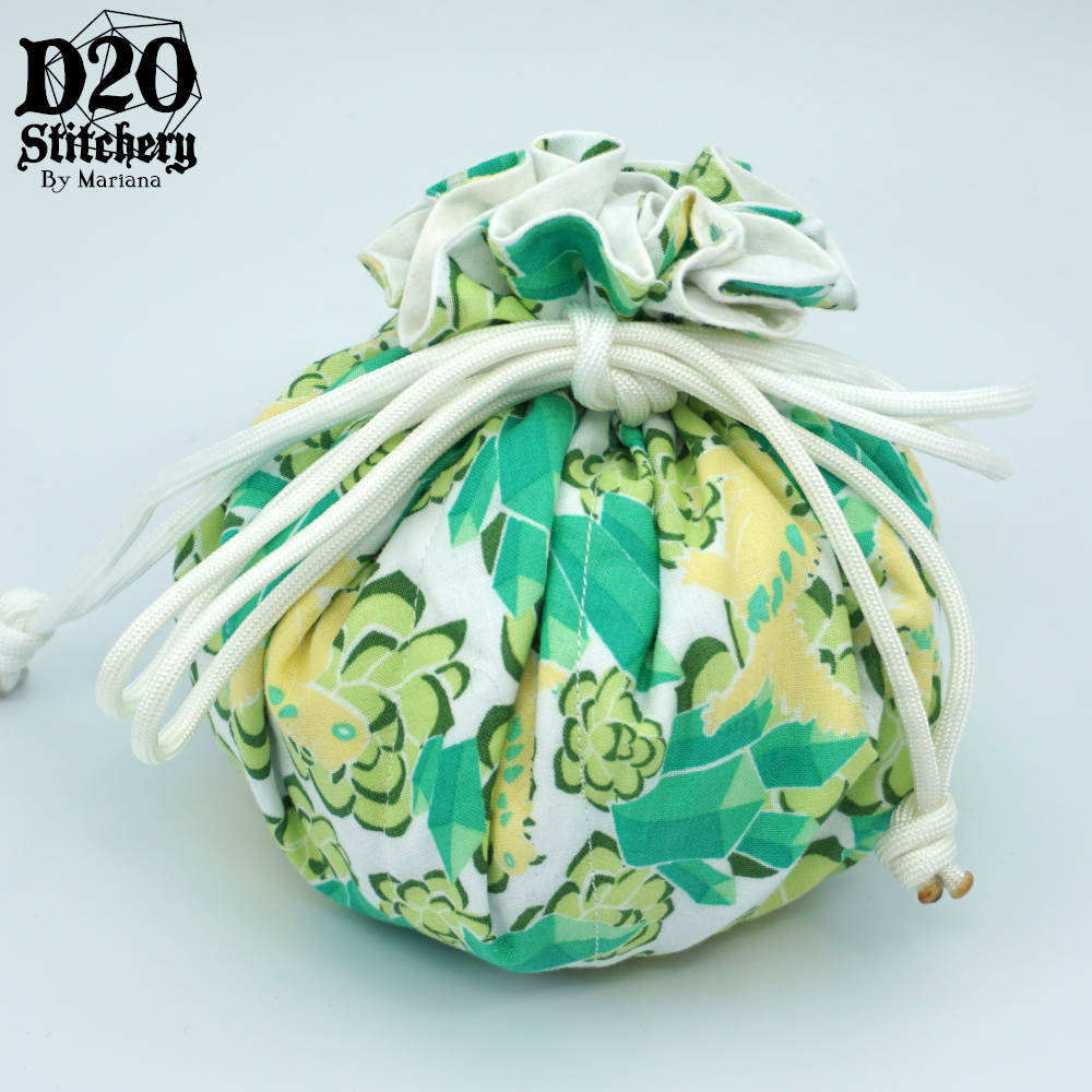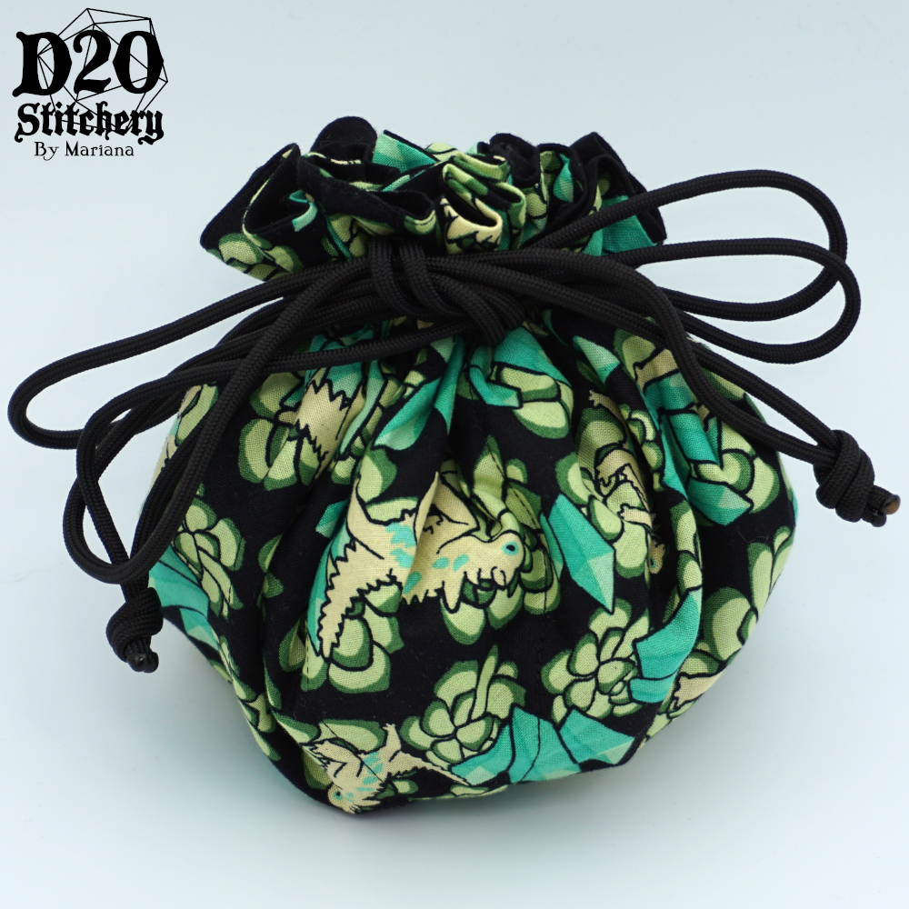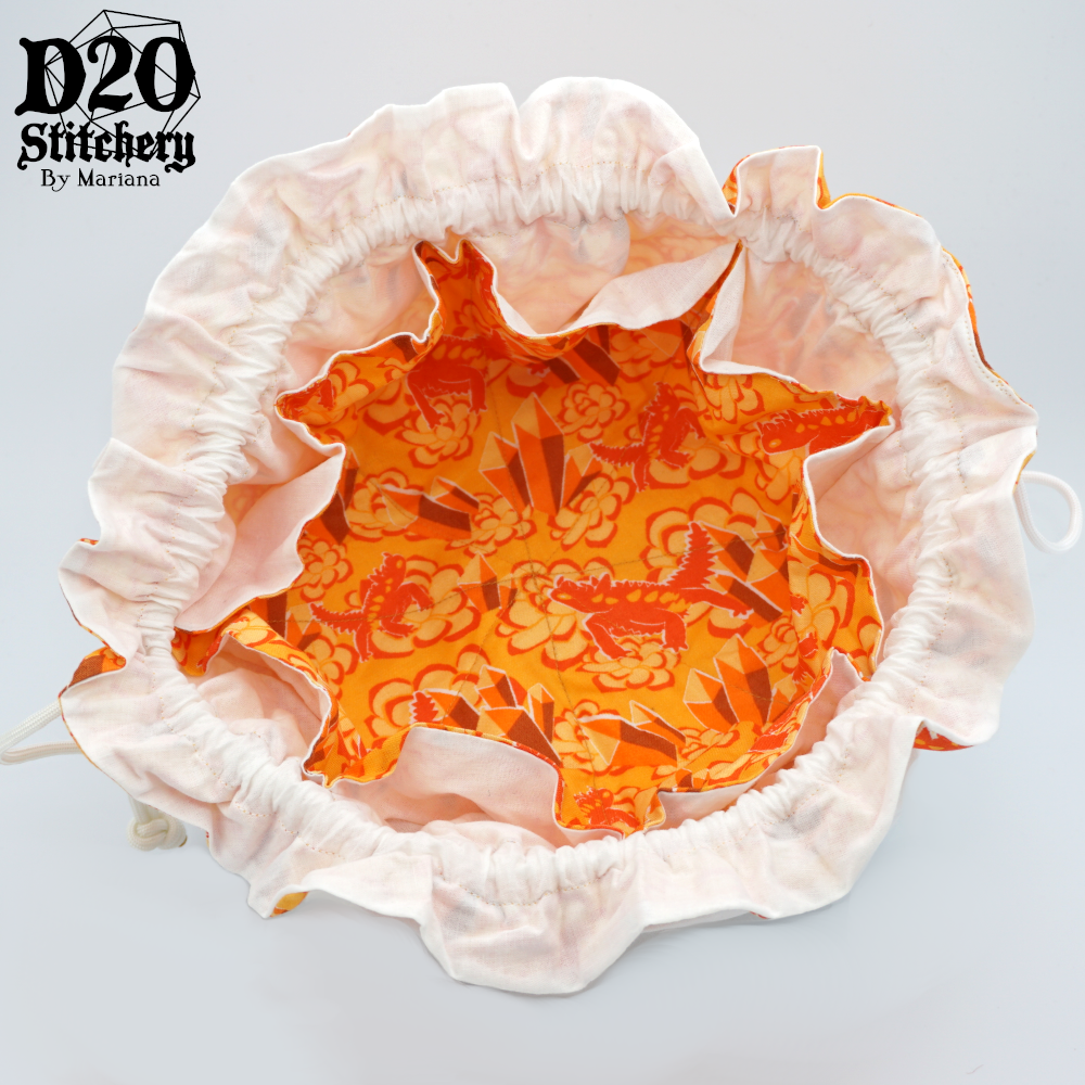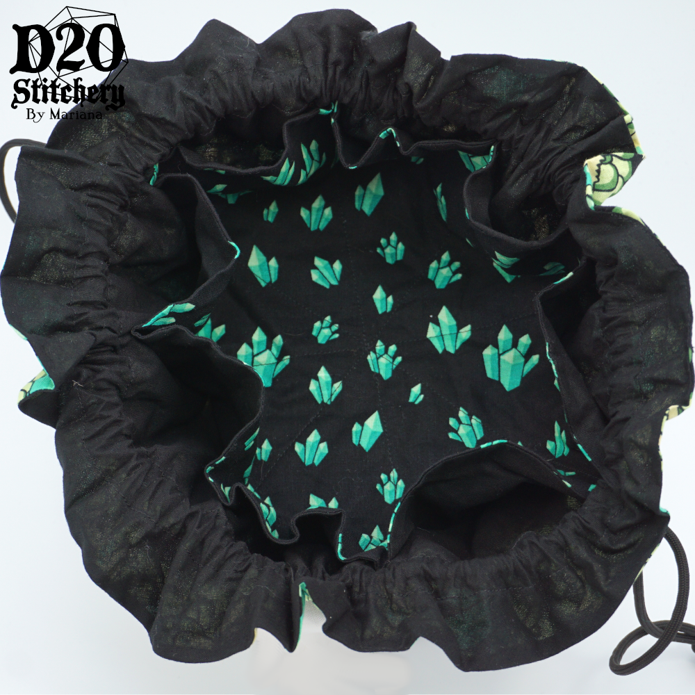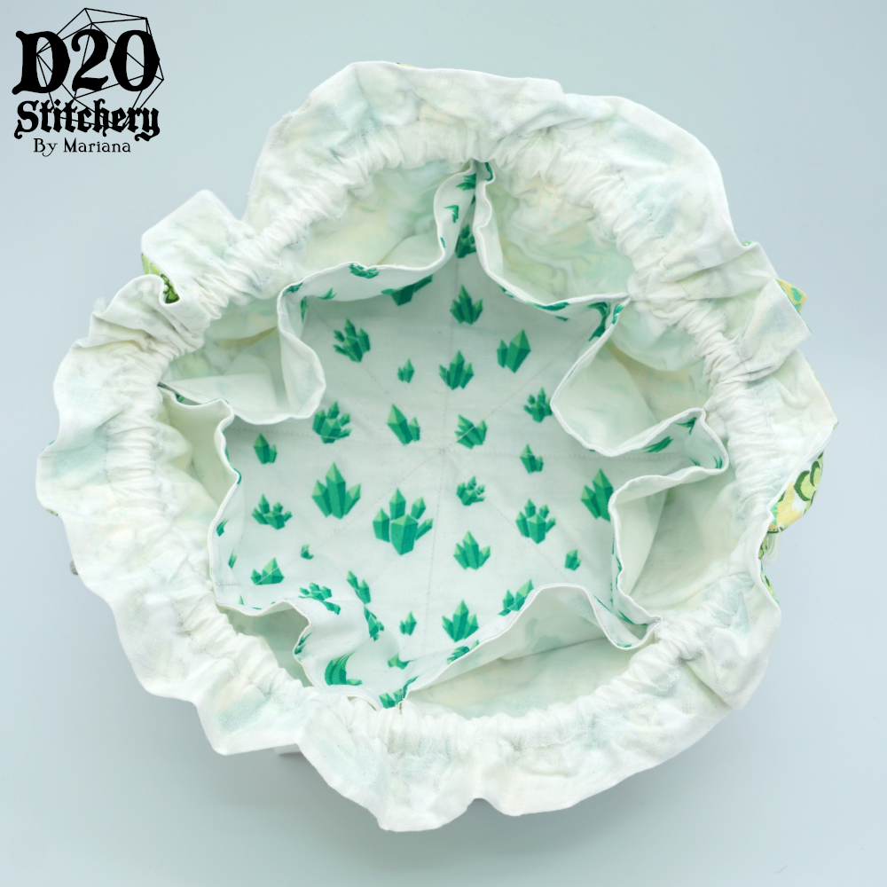 A hand-crafted, 8-pocket drawstring dice bag to take on all your epic quests! So big, there will even be room left over for a mini, tokens, or whatever your heart desires. This bag looks small on the outside, but has tons of room on the inside! The bag can be opened completely to transform into a dice tray, and the sides still stay up to keep excited dice from bouncing away!