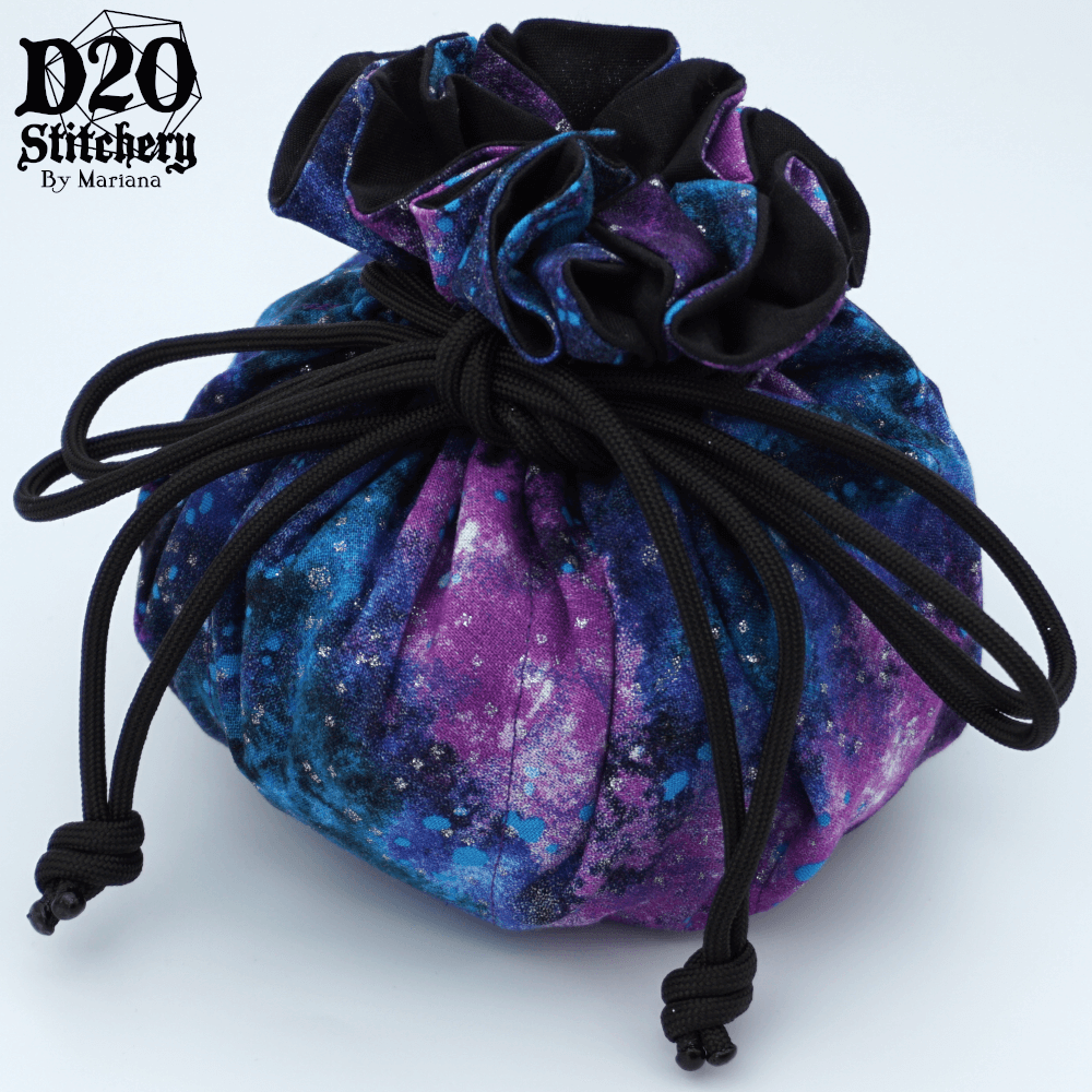 A hand-crafted, 8-pocket drawstring dice bag to take on all your epic quests! So big, there will even be room left over for a mini, tokens, or whatever your heart desires. This bag looks small on the outside, but has tons of room on the inside! The bag can be opened completely to transform into a dice tray, and the sides still stay up to keep excited dice from bouncing away!