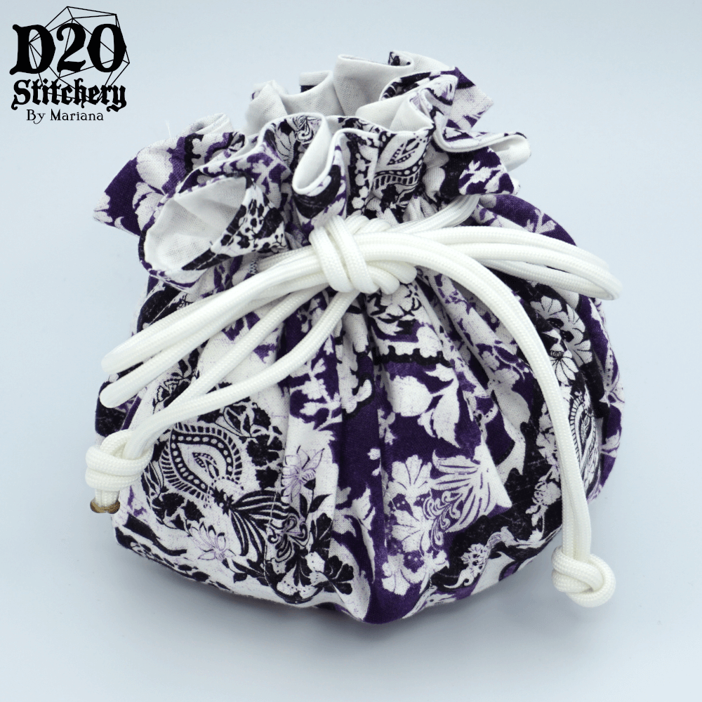 A hand-crafted, 8-pocket drawstring dice bag to take on all your epic quests! So big, there will even be room left over for a mini, tokens, or whatever your heart desires. This bag looks small on the outside, but has tons of room on the inside! The bag can be opened completely to transform into a dice tray, and the sides still stay up to keep excited dice from bouncing away!