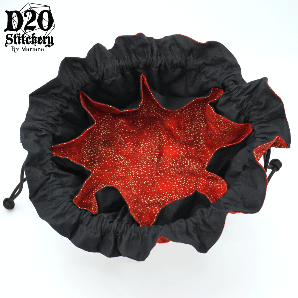 A hand-crafted, 8-pocket drawstring dice bag to take on all your epic quests! So big, there will even be room left over for a mini, tokens, or whatever your heart desires. This bag looks small on the outside, but has tons of room on the inside! The bag can be opened completely to transform into a dice tray, and the sides still stay up to keep excited dice from bouncing away!